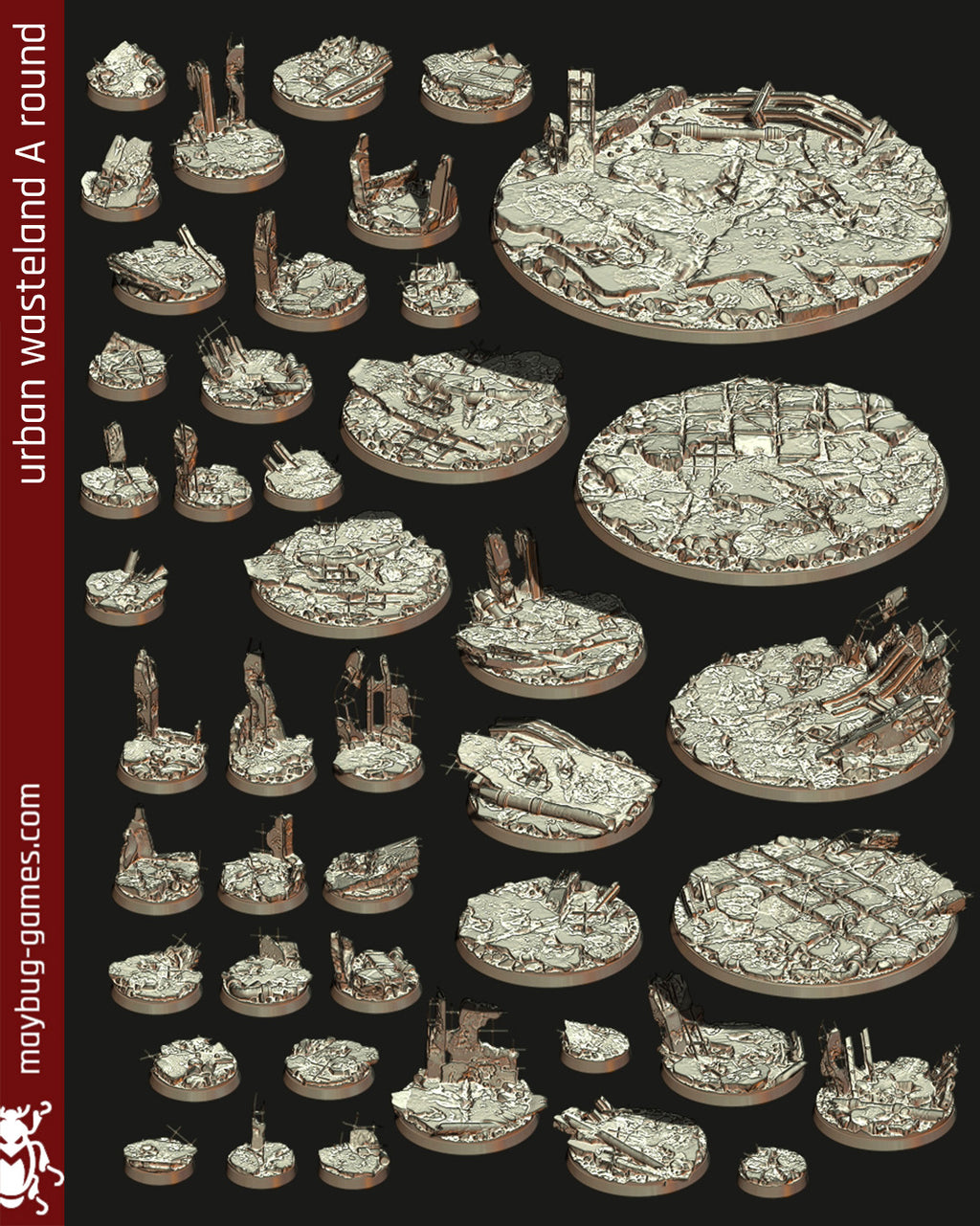 Round bases, physical items.Designed and exclusively produced by Maybug Games.Durable resin, highest quality 3d printers. Small post processing advised (sanding).Size is in millimeters, bottom dimension. 25r = 25 millimeters round (approximately)